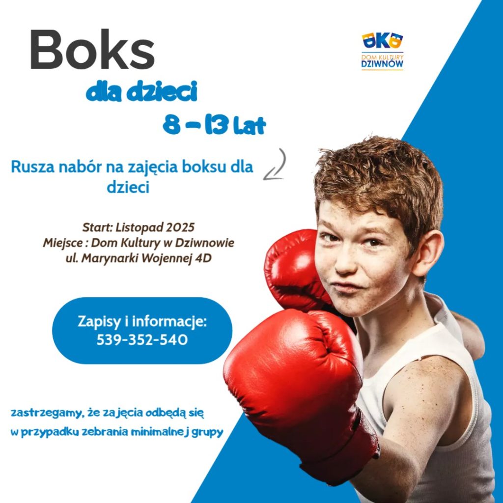Dom Kultury w Dziwnowie serdecznie zaprasza wszystkie dzieci w wieku 8-13 lat na zajęcia bokserskie pełne energii, zabawy i sportowych emocji! 👊 Dlaczego warto?